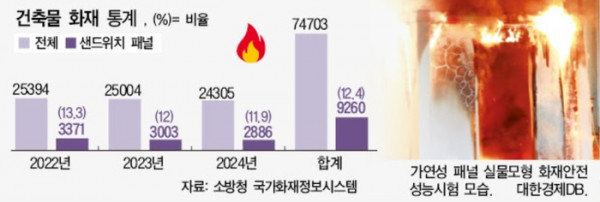 소방청 통계에 따르면 3년(2022∼2024년)간 국내 건축물 화재는 총 7만4703건 발생했다. 이 가운데 샌드위치패널(이하 패널) 건축물 화재가 12.4% (9260건)를 차지했다. 국내 화재 10건 중 1건 이상은 패널 건축물에서 발생하는 셈이다.